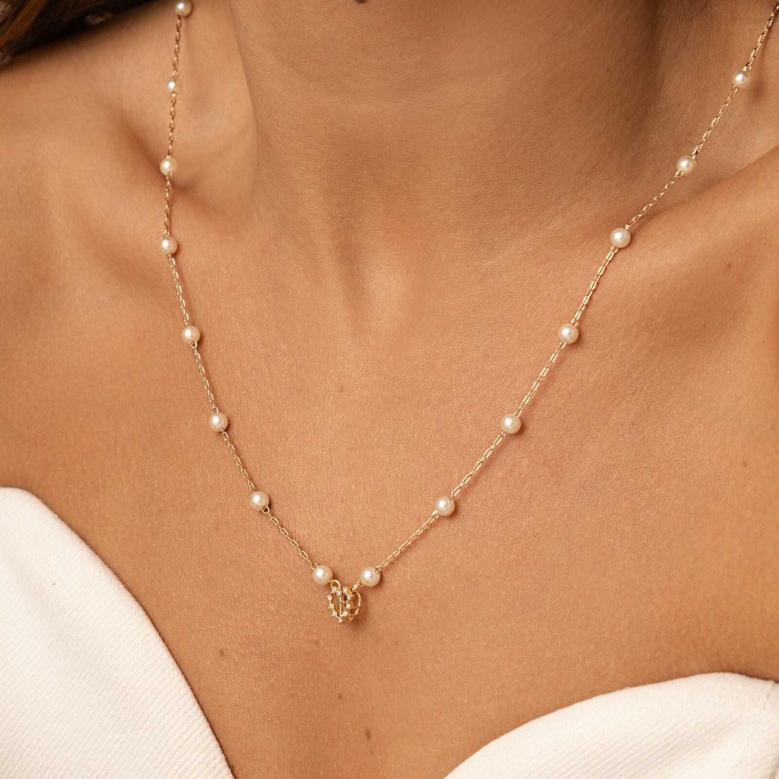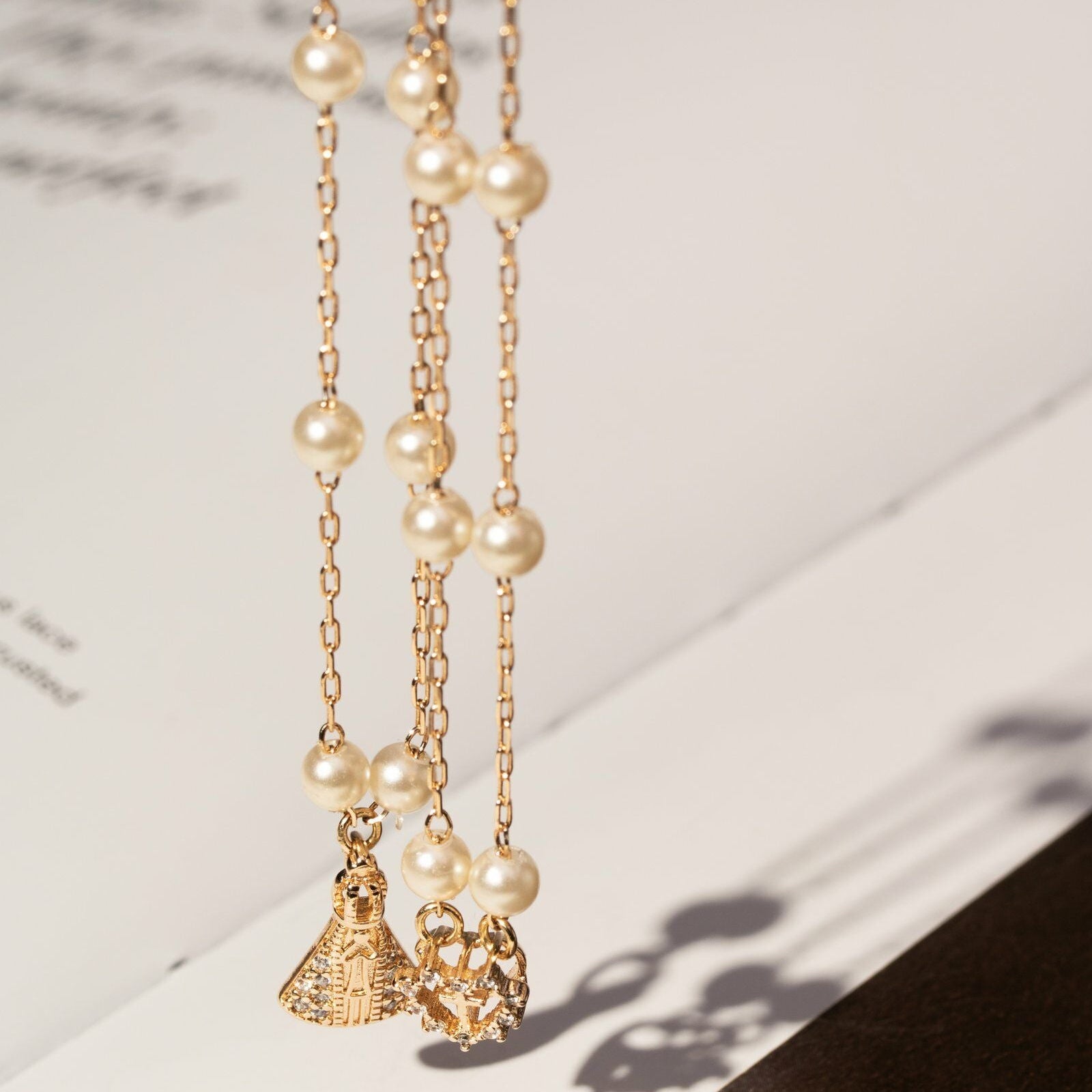 Collar escapulário en perlas con Colgates Nuestra Señora Aparecida y Corazón con Cruz delicado en baño de oro 18k con circonitas blancas.
