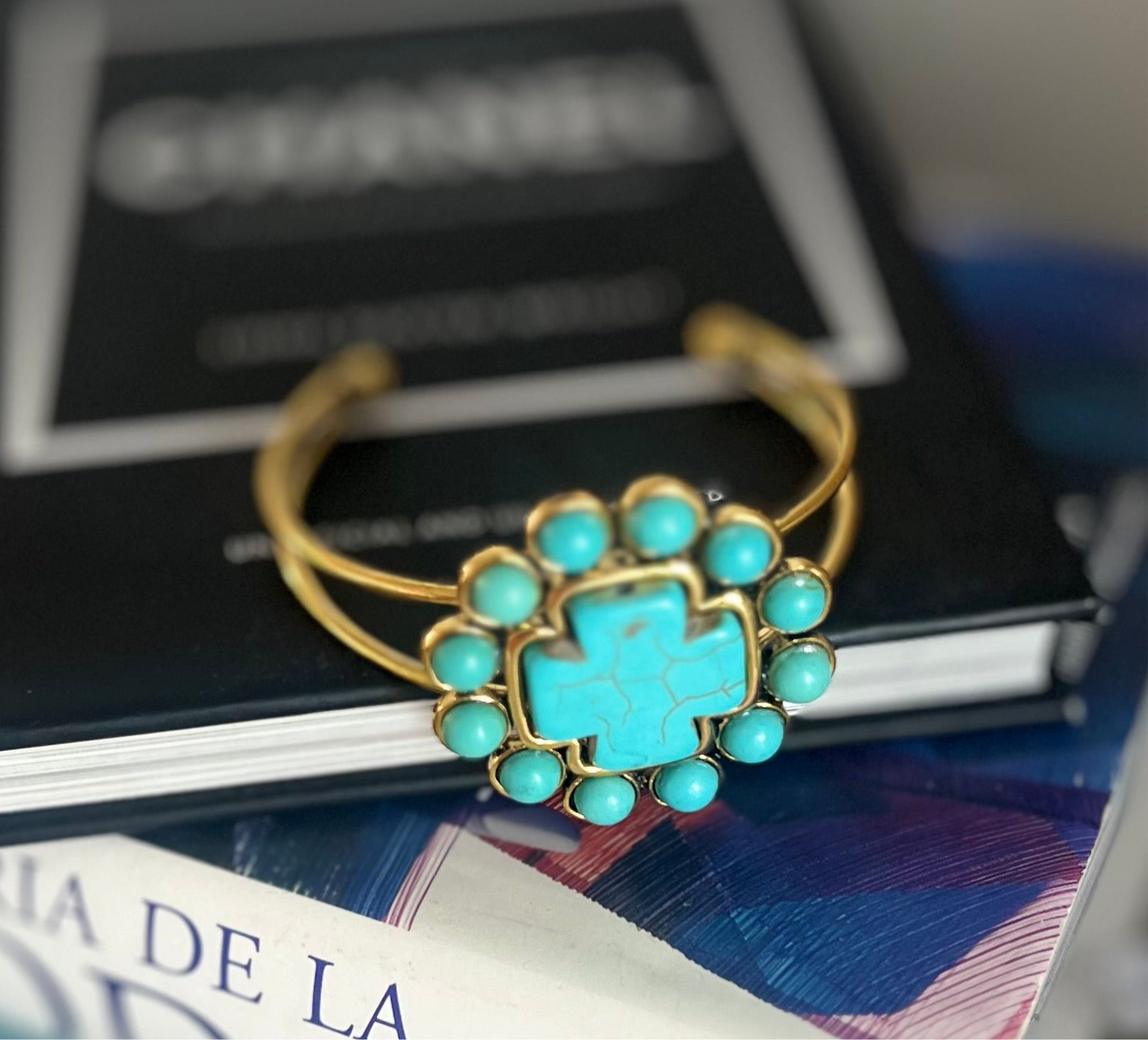 Bracelete ajustable Cruz resina turquesa en baño de ouro 18k. Super fashion.