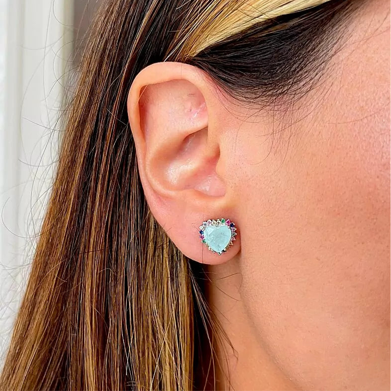 Pendiente Corazón Fusión con Turmalina light y Circonitas de Color, Montura de 4x4 Grapas, Plata 925