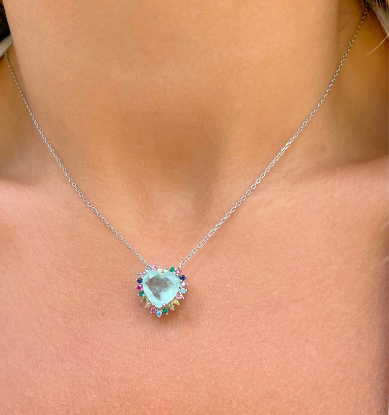 Conjunto Collar + pendiente corazón turmalina light fusión en plata925 con mini circonitas coloridas.