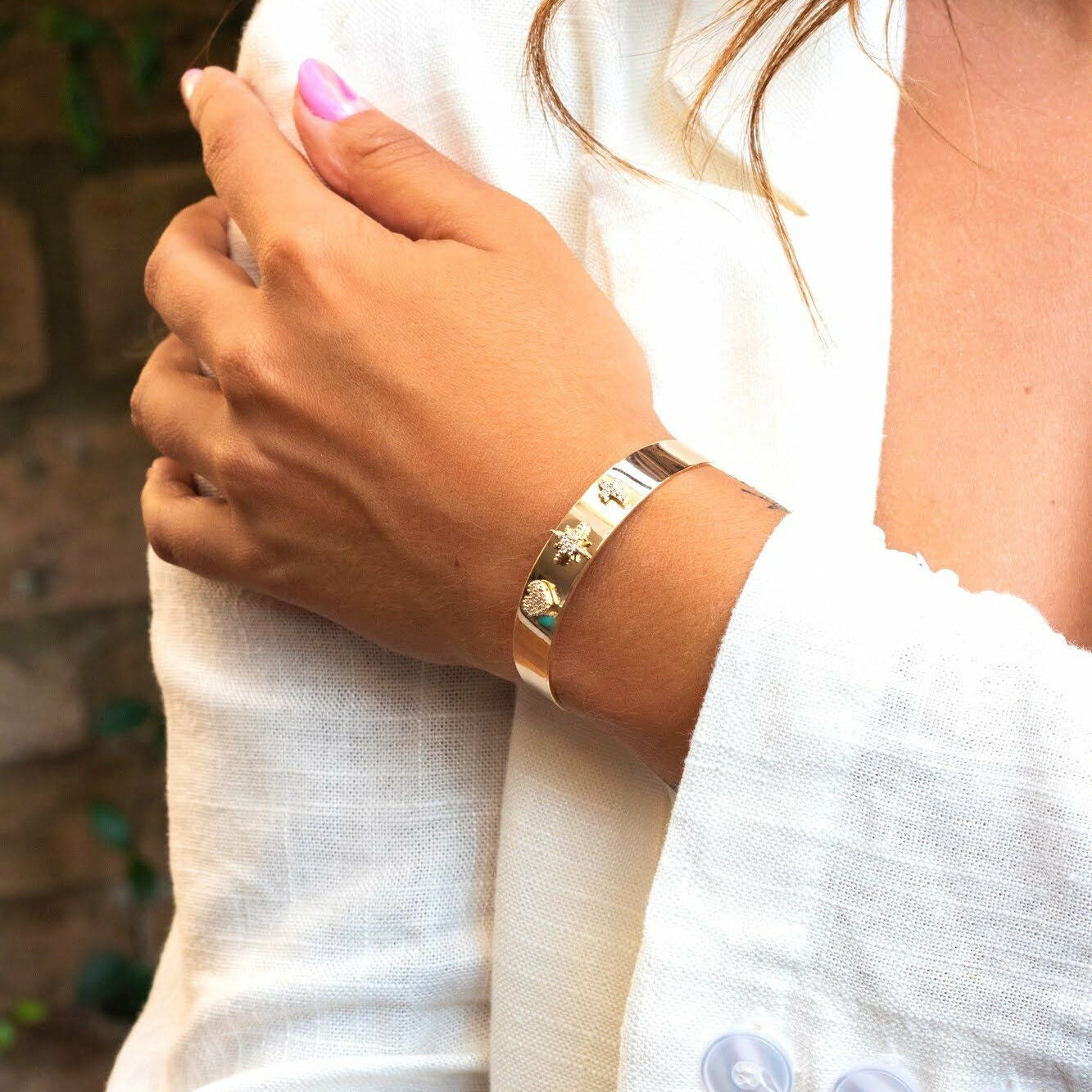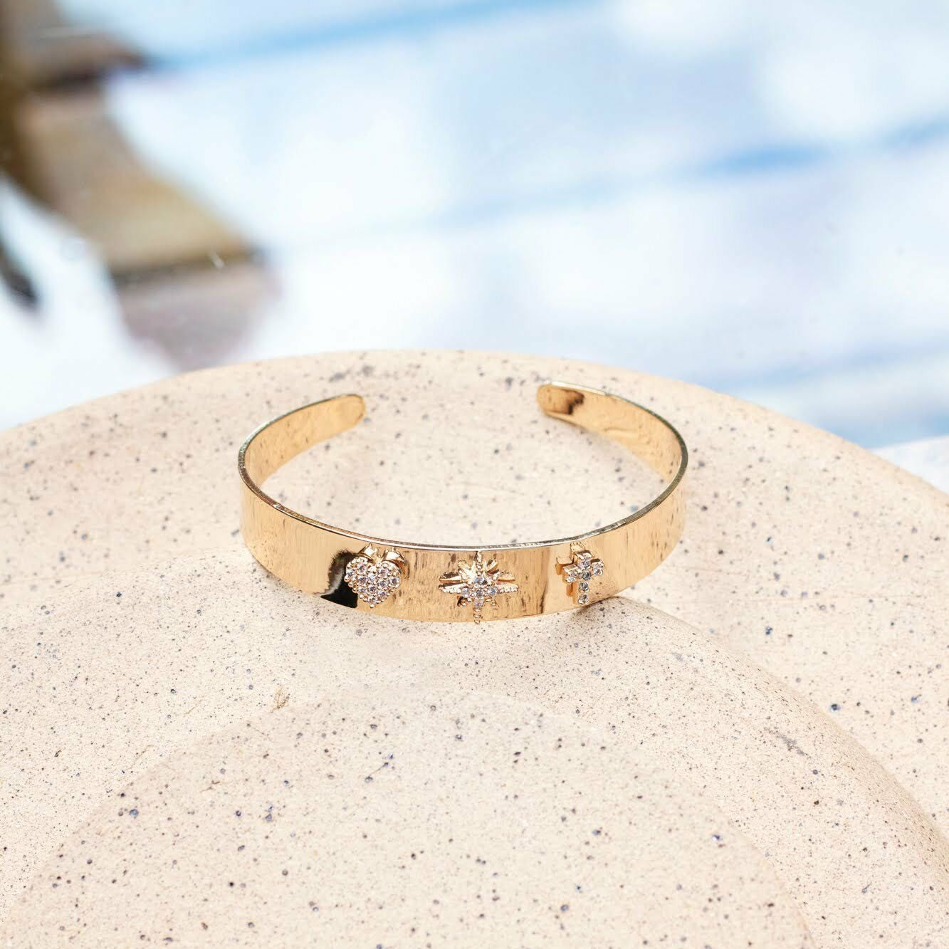 Bracelete dorado con circonitas blancas en la Cruz, estrella y un corazón.