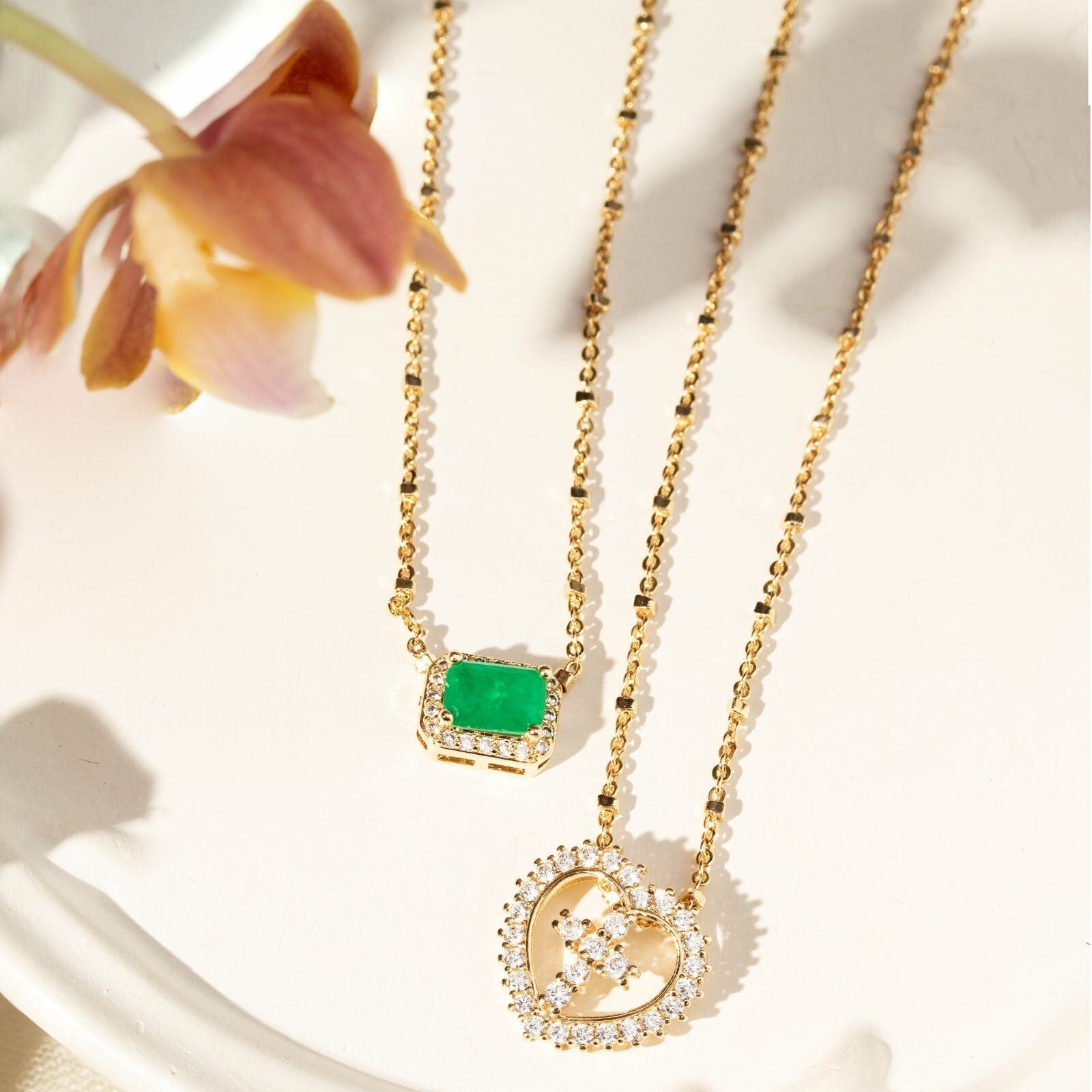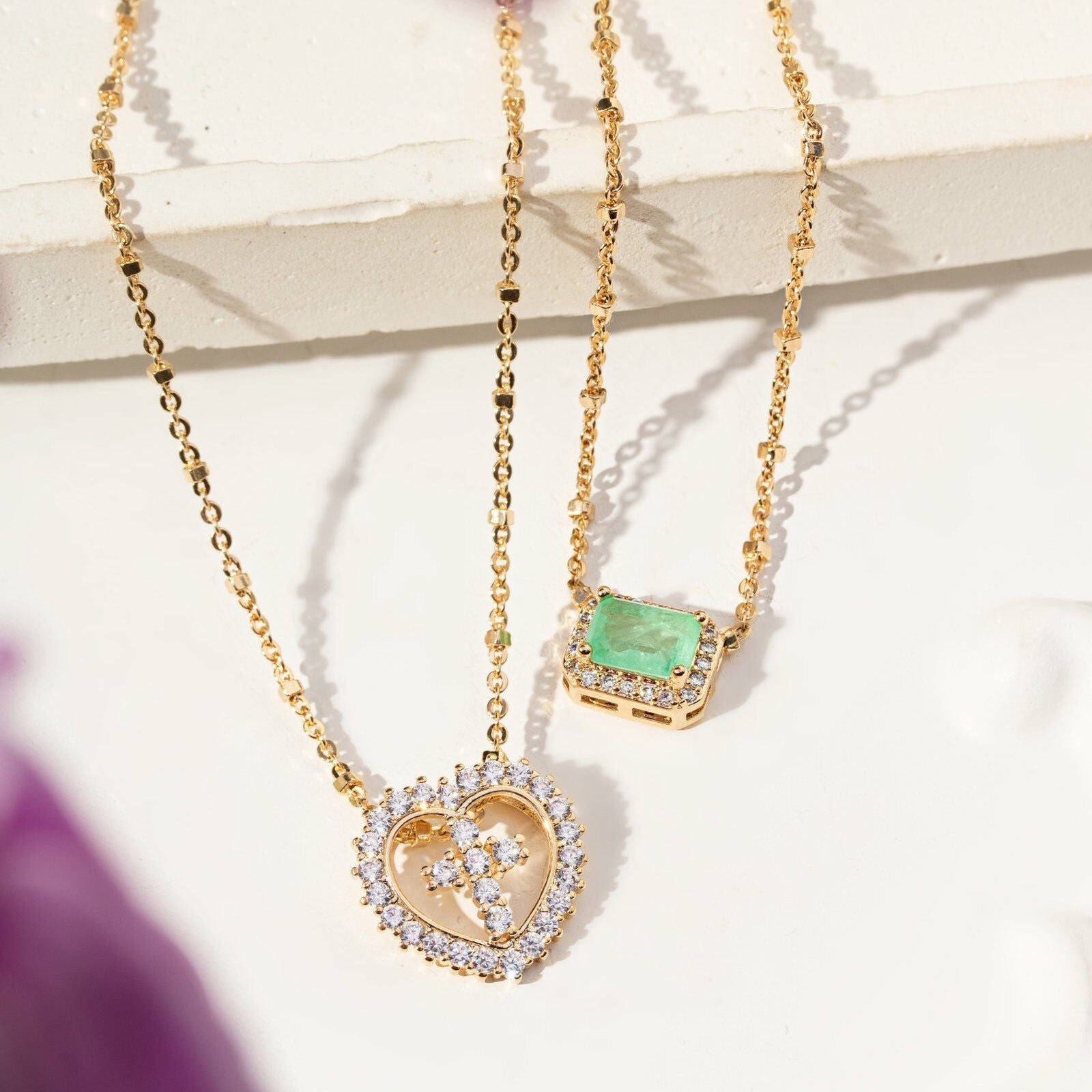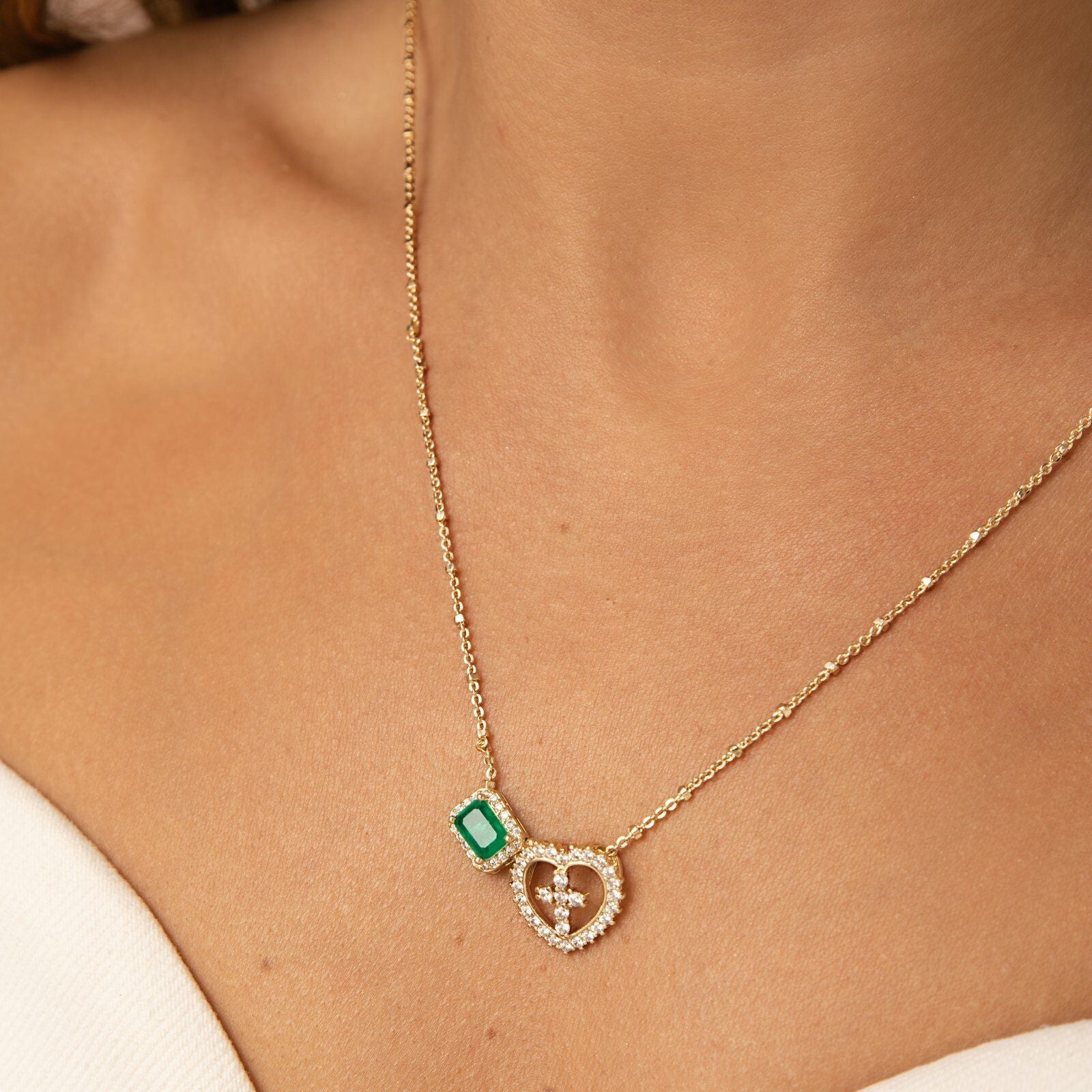 Collar escapulário esmeralda colombiana o con piedra verde esmeralda cuadrado y otro lado en corazón con baño de Oro18k
