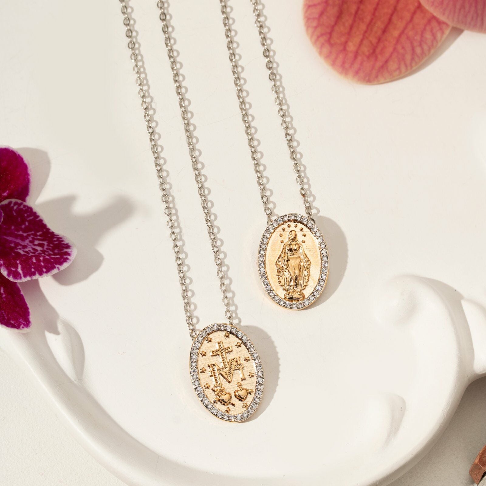 Collar escapulário medalla milagrosa con Nuestra Señora das Gracias delicado en baño de oro 18k con circonitas blancas.