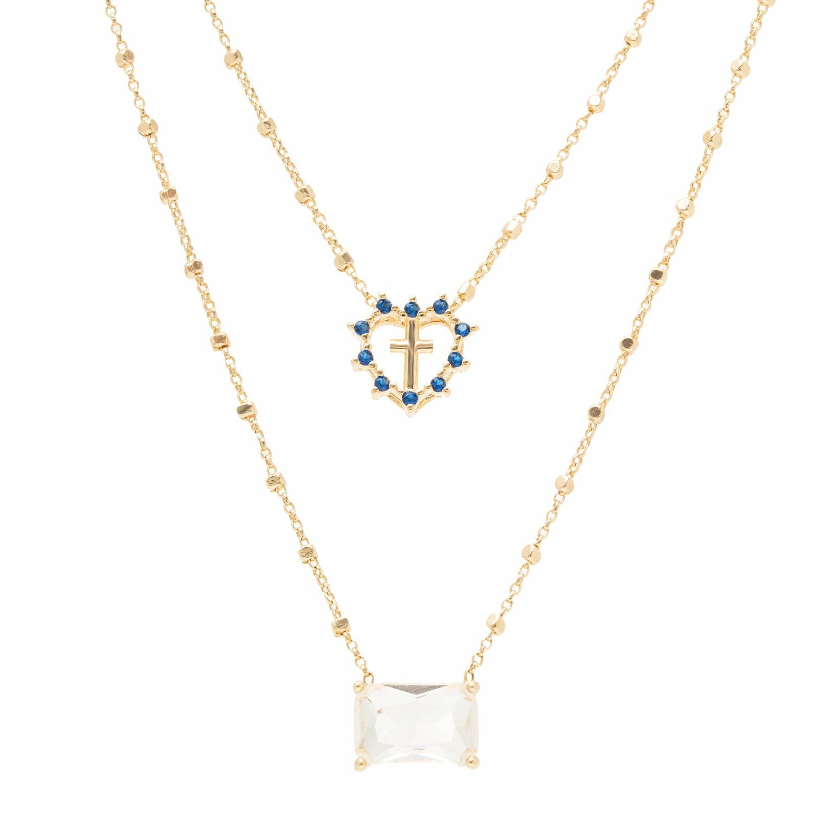 Collar escapulário en cadena bolas con Colgates cristal blanco y Corazón con cruz azul en baño de oro 18k con circonitas azules.