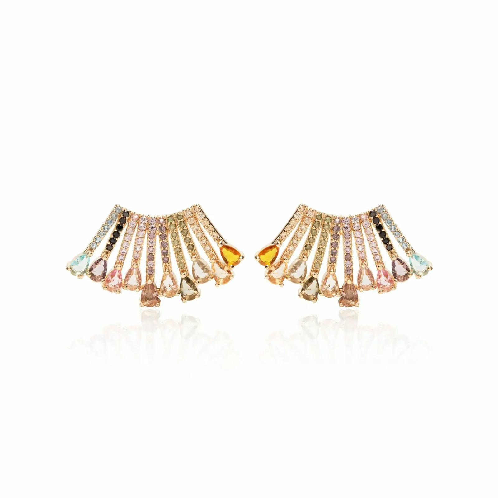 Pendiente delicado líneas leque dorado con circonitas coloridas  con baño de Oro18k. Súper exclusivo para una fiesta o boda.