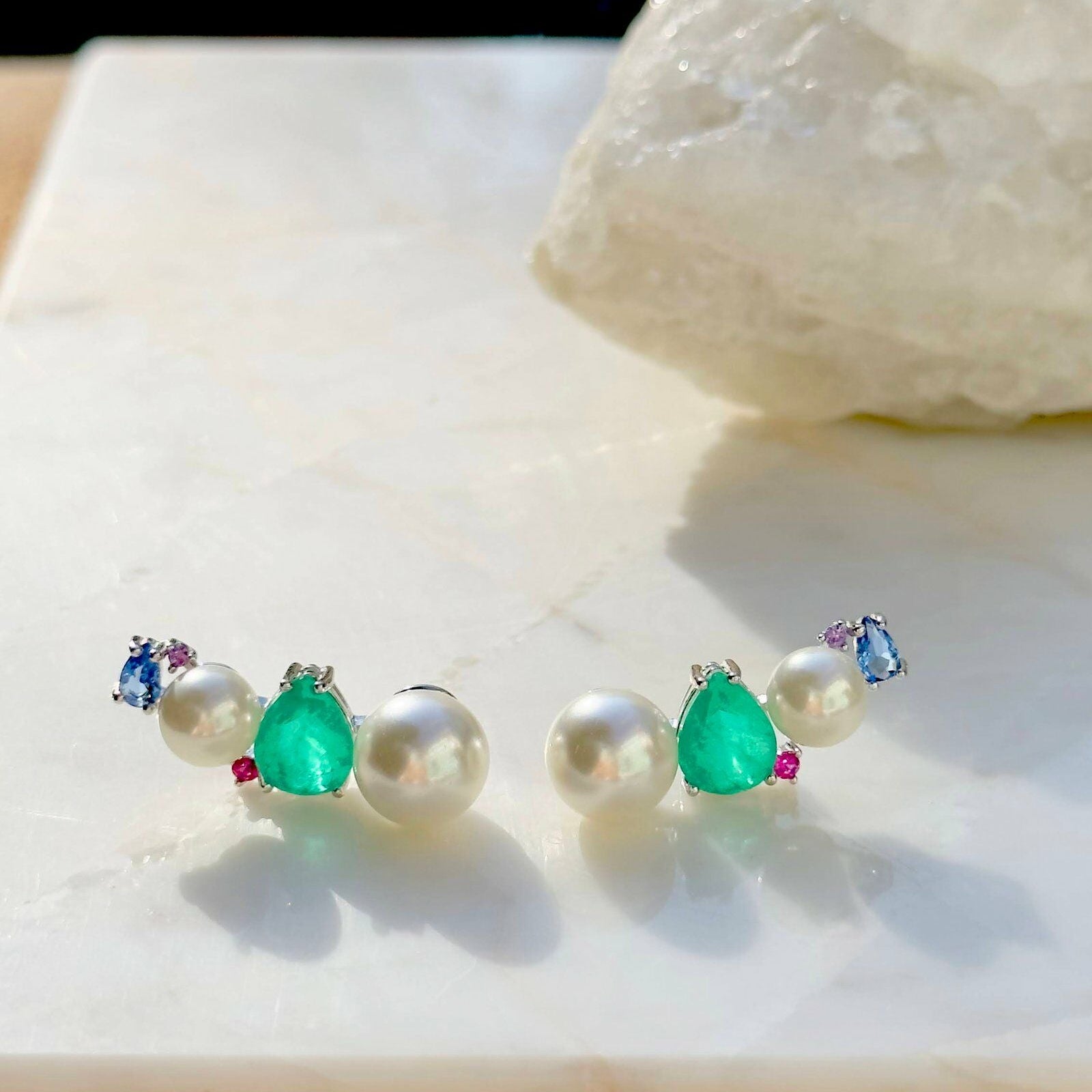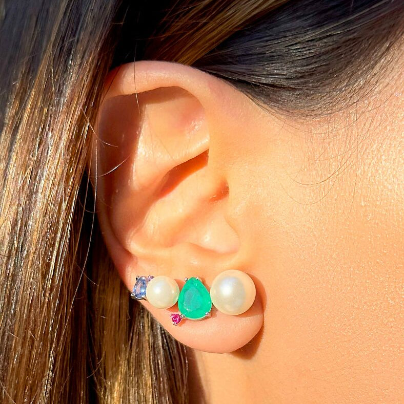 Pendiente perla esmeralda fusion con turmalina rosa y rubi cravejadas en Plata 925.