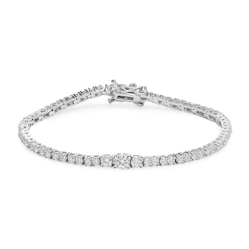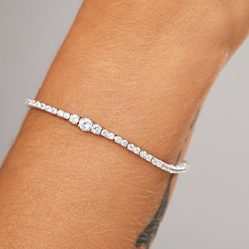 Pulsera circonia redonda plata925 con Baño de rodio e 3 circonitas mas grandes en frente.